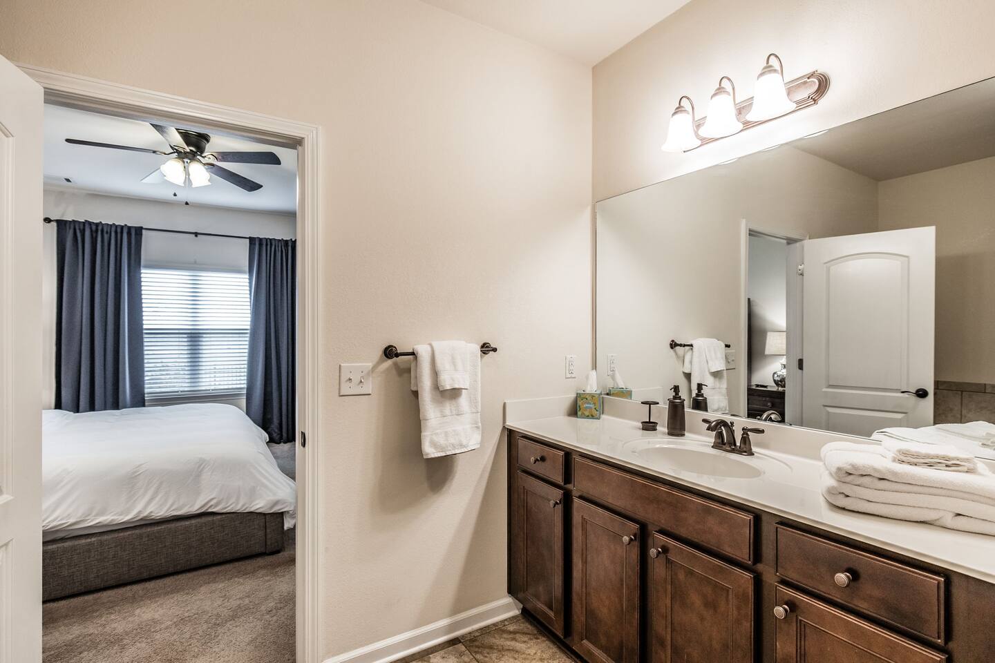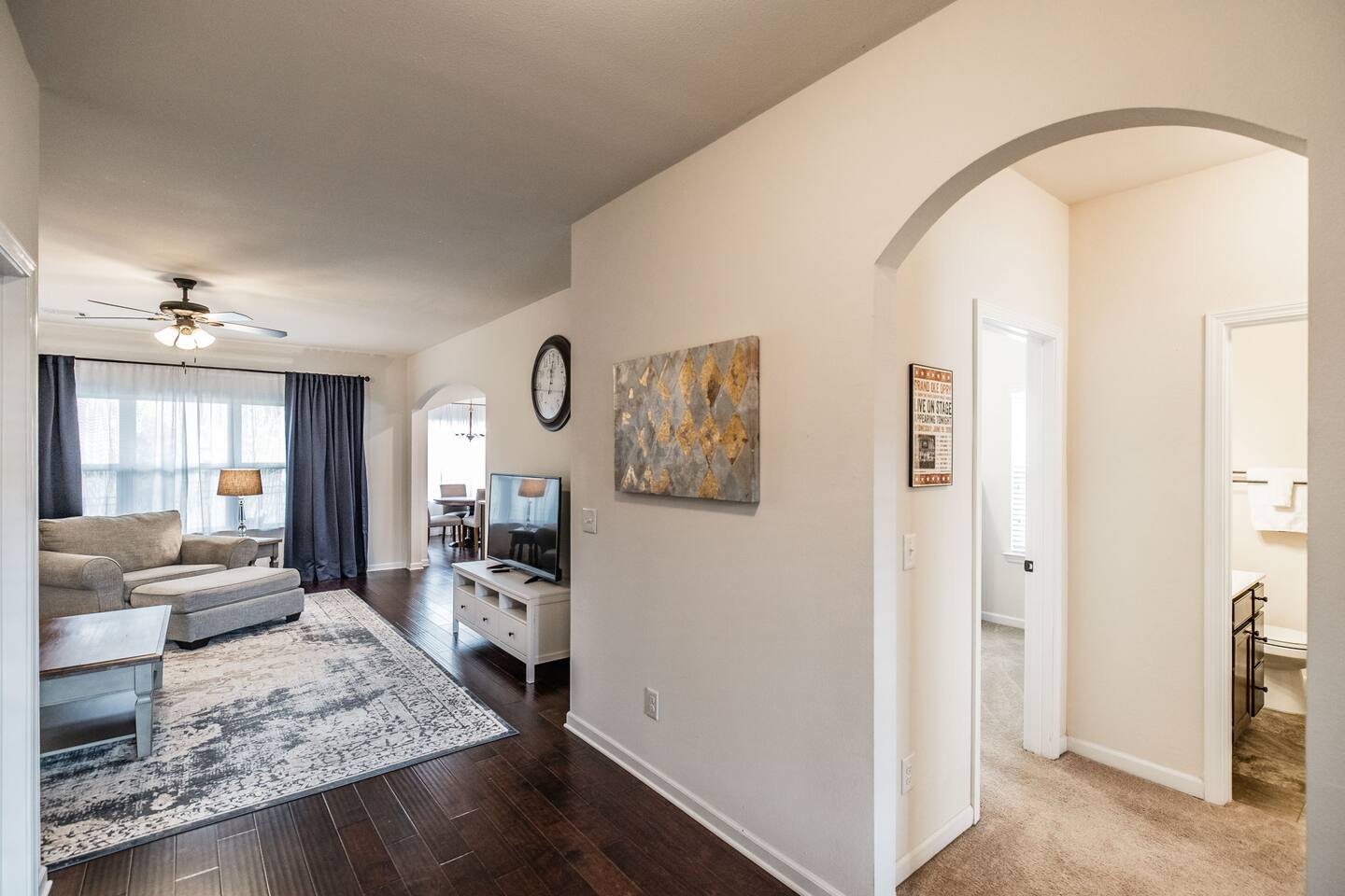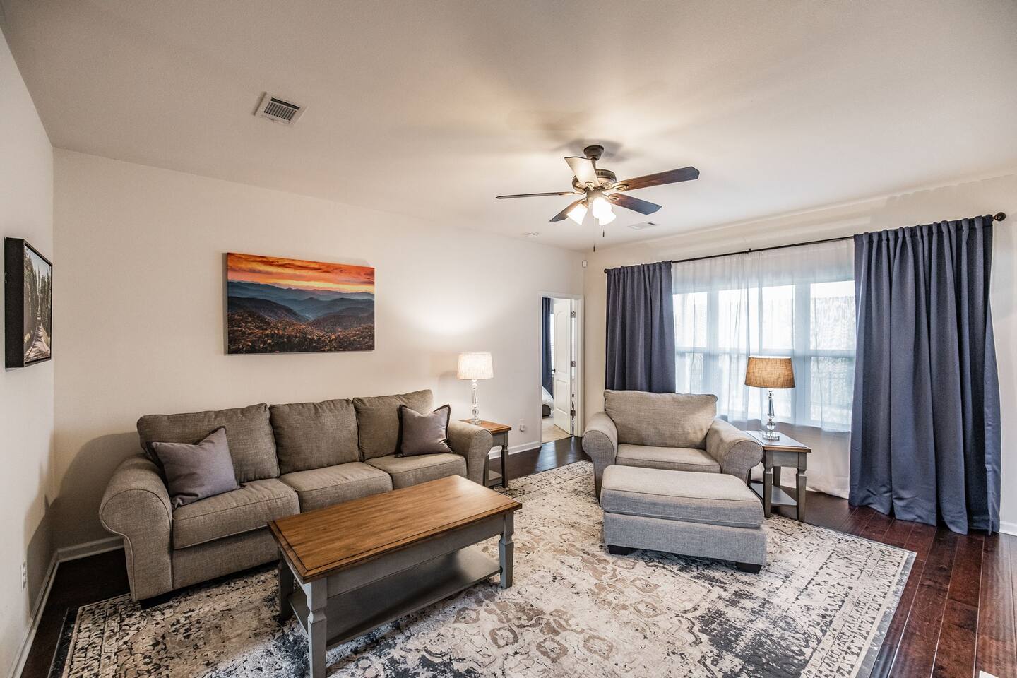 🛏 Sleeps 4 comfortably • King bed in the private primary suite • Queen bed in the second bedroom • Each bedroom has its own bathroom 🍳 Spacious kitchen for gathering Enjoy a large kitchen with island seating plus a separate dining room—perfect for meals, coffee, or planning the day’s adventures. 🛁 Relaxing primary suite The primary bathroom features a soaking tub and stand-alone shower for a spa-like retreat. 🌿 Private fenced backyard Great for enjoying morning coffee or relaxing outside after a day exploring Gallatin and nearby Nashville. 💻 Dedicated office space A third room is set up as a designated office with a desk and chair, perfect for remote work, planning your trip, or a quiet place to focus. 🚗 Parking Driveway parking for up to 2 vehicles. No trailers and no street parking permitted in the neighborhood. ✨ Easy access home Zero-entry design with no steps makes arrival and moving around the home simple and convenient. Whether you're visiting family, working nearby, or exploring the Gallatin area, this home offers a comfortable and peaceful place to stay.